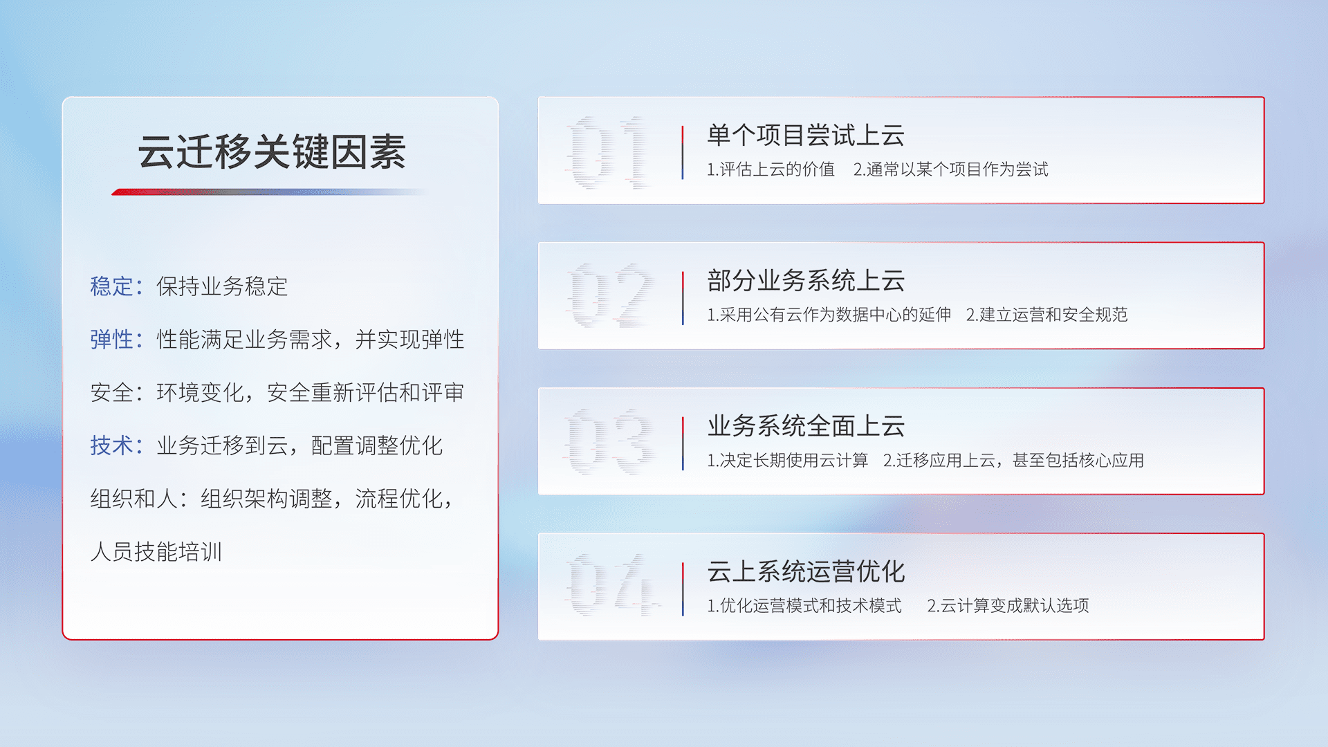 结合实际业务,,,从规划设计、、、云平台选型、、、、云原生改造、、、、数据迁移、、、、集成交付,,,,迁移全过程为客户识别最佳上云路径,,做好风险识别管理,,,设计网络架构、、、、身份权限、、安全审计合规、、、操作审计、、、、日志审计、、、监控告警策略、、、、多站点容灾设计等,,对云上基础设施进行整体规划,,,提升IT治理水平,,,,以满足弹性、、、高可用、、高性能的需求。。。。