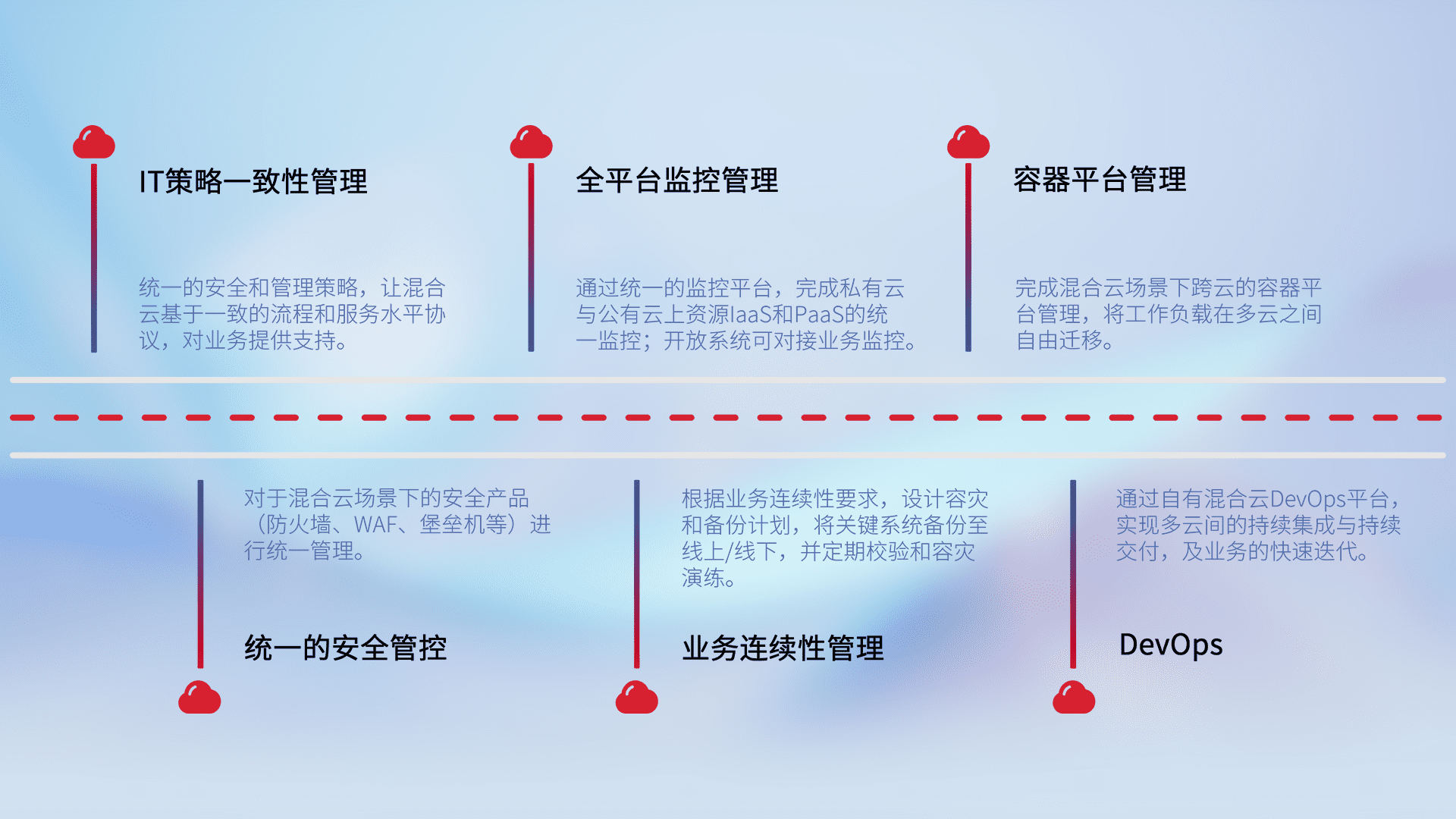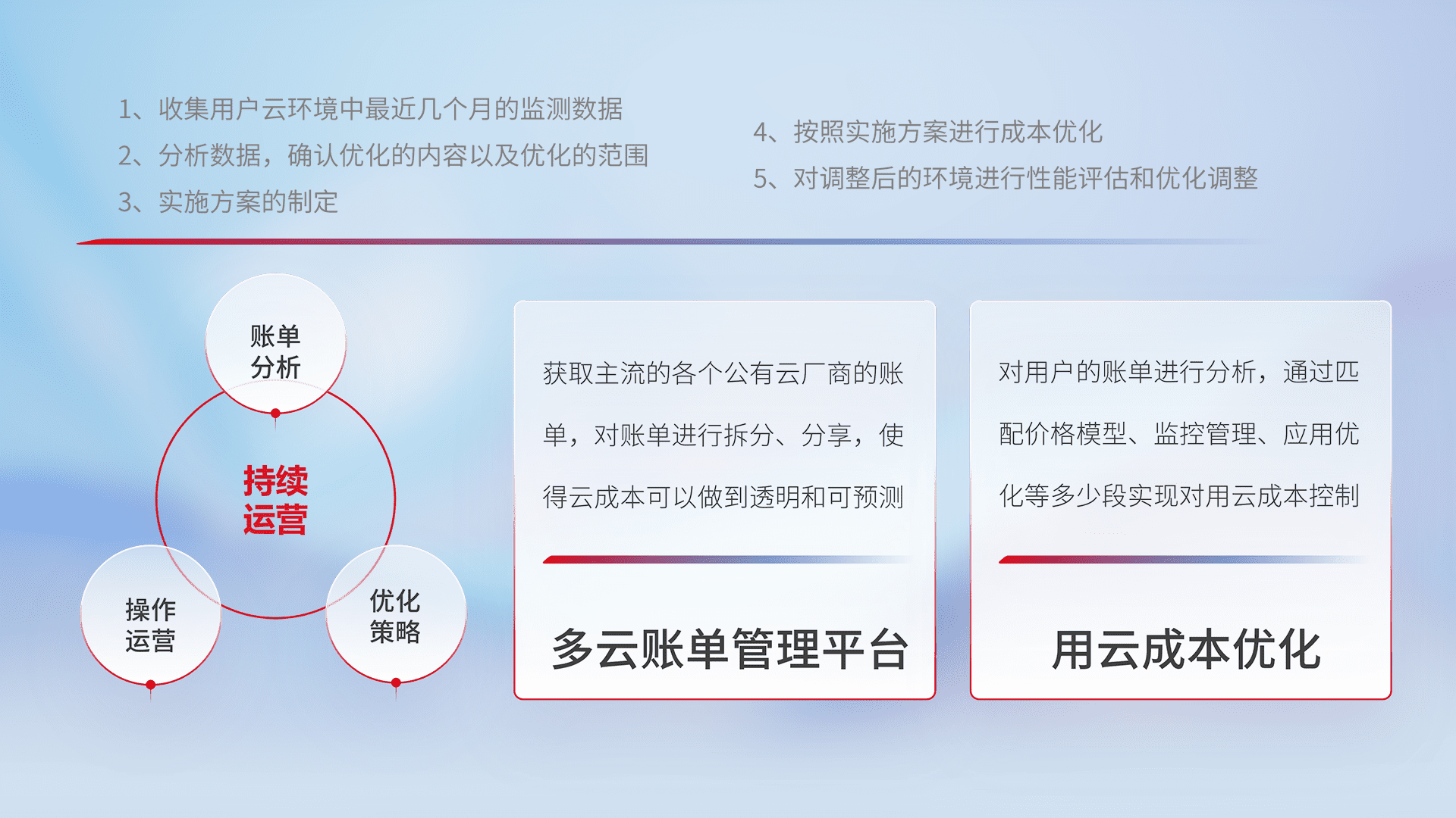 通过多云纳管,,,以统一的资源数据模型把客户的云资源进行抽象和封装,,,,进而实现对多云资源的统一操作,,,保障云资源管理的可靠性、、、稳定性与可用性。。量身定制化运维内容,,,配置、、开发运维、、、、补丁管理、、、备份、、、、监控、、认证和访问管理、、审计和日常巡检等,,,,保障在用云过程中的可靠度,,,,稳定度以及高可用率。。。